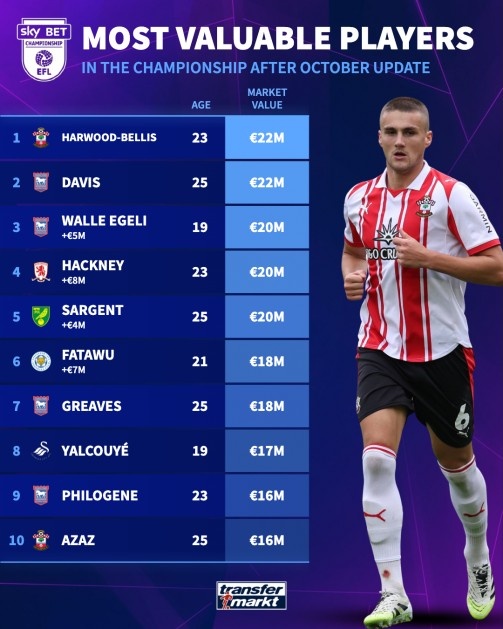 10月6日讯 德转更新英冠球员身价,在现在的英冠球员身价中,南安普顿球员贝利斯和伊镇球员戴维斯2200万欧并排第一。