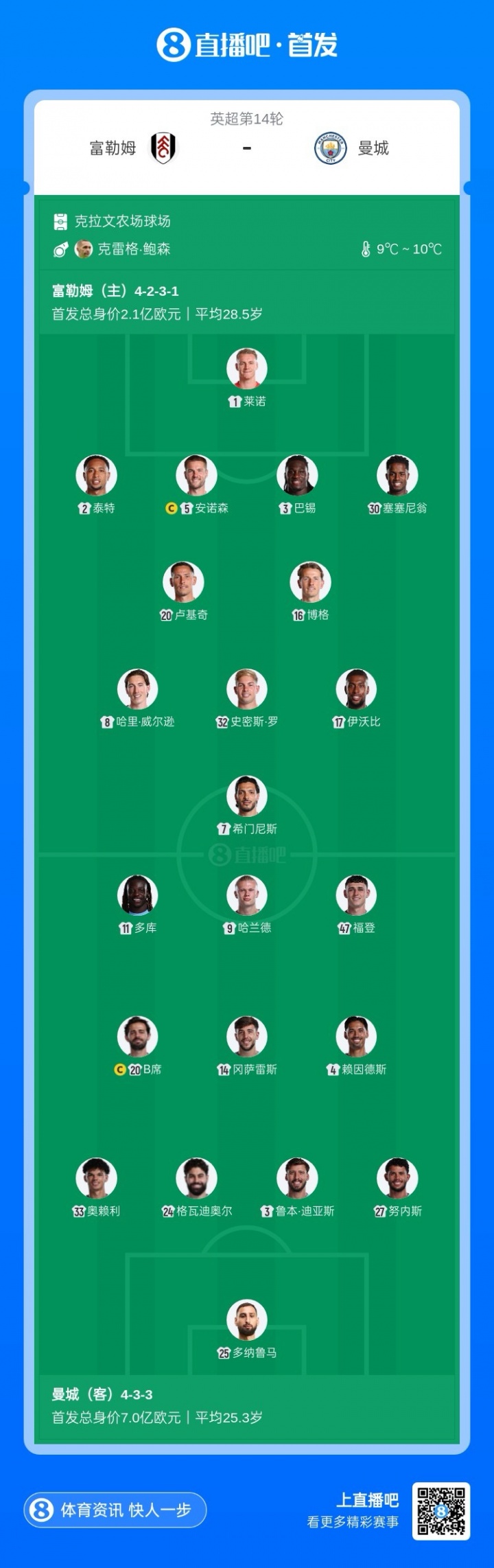 曼城首发:25-多纳鲁马、27-努内斯、3-迪亚斯、24-格瓦迪奥尔、33-奥赖利、14-尼科、20-B席、4-赖因德斯、47-福登、11-多库、9-哈兰德
