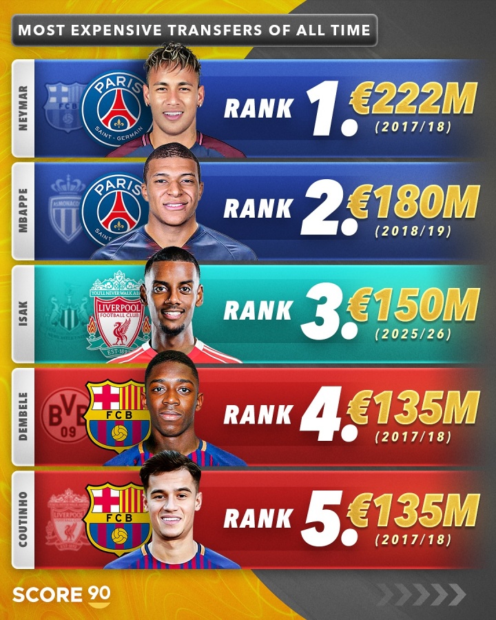 💰足坛历史最贵TOP10:内姆前2,伊萨克跃居第3!利物浦2东说念主上榜