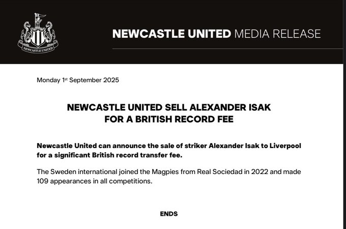 纽卡斯尔官方也发表了伊萨克转会的官方公告,但推行仅37个单词。记者Keith Downie对此发文点评。