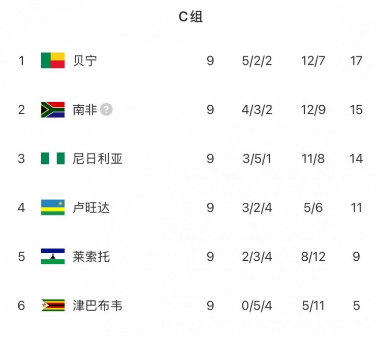 当今预选赛9轮战罢,尼日利亚3胜5平1负积14分,排在C组第三,距榜首贝宁有3分差距;莱索托9战2胜3平4负9分位列第五。