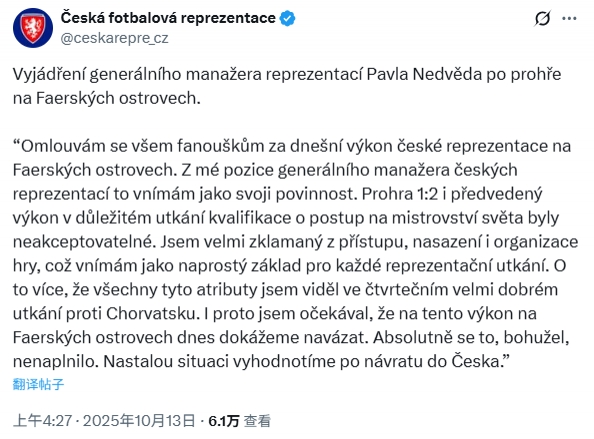 此役失利后,捷克国度队官推发布了捷克国度队总司理内德维德的致歉声明。