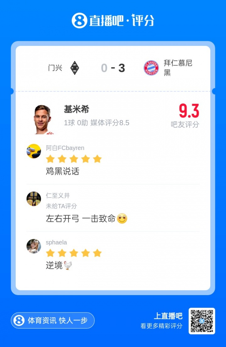第八轮评比效果出炉,基米希首开记载,匡助拜仁客场3-0完胜门兴成绩8连胜领跑德甲,最终赢得吧友1.4万票撑捏,当选【X小红书德甲第8轮最好球员】!