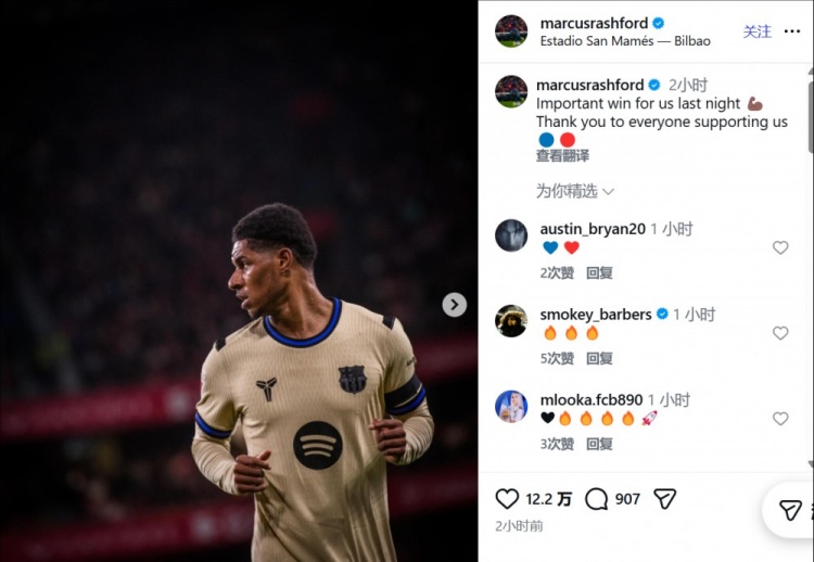 3月9日讯 在巴萨1-0击败毕尔巴鄂竞技后,拉什福德更新了社媒。