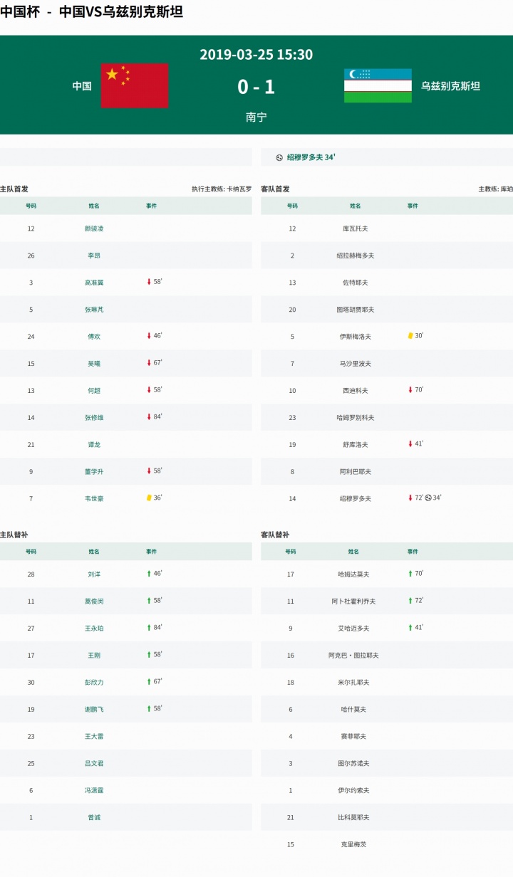 2019年3月25日,第三届中国杯季军争夺战在中国队和乌兹别克斯坦之间进行。上半场国足要紧端毫无亮点,绍穆罗多夫爆射破门,韦世豪狠恶飞铲染黄,下半场对方错失屡次良机。最终国足0-1不敌乌兹别克斯坦,当届中国杯两连败且一球未进,排行垫底。
