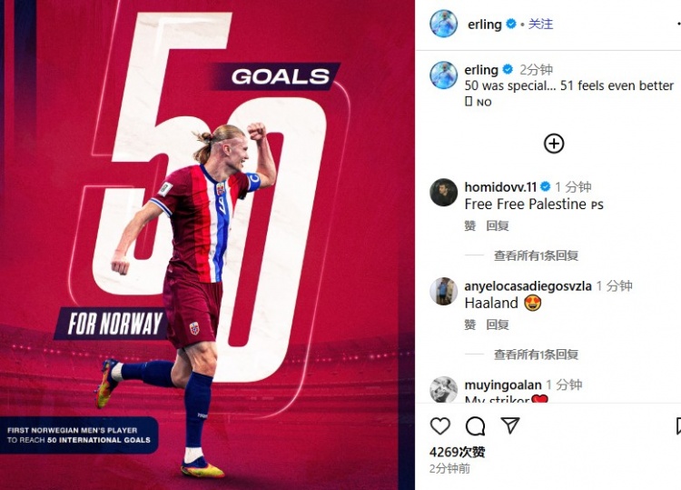 哈兰德在社媒配文中写说念:“第50球很终点……但第51球的嗅觉会更好😉🇳🇴”