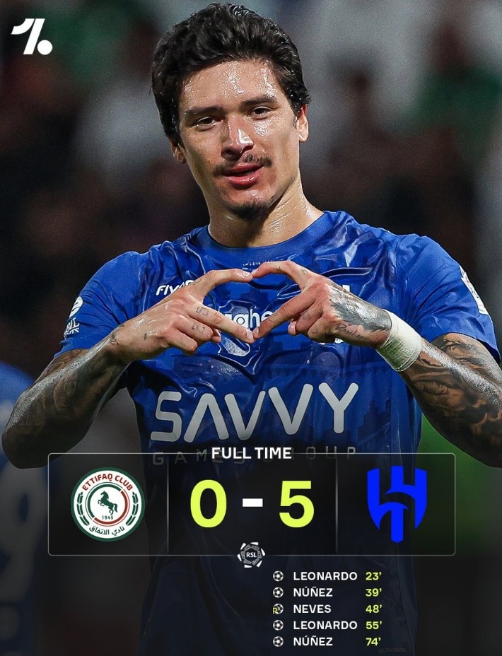 本场比赛努涅斯首发出场梅开二度,此前莱昂纳多一样梅开二度、鲁本-内维斯打进点球,匡助球队大获全胜。