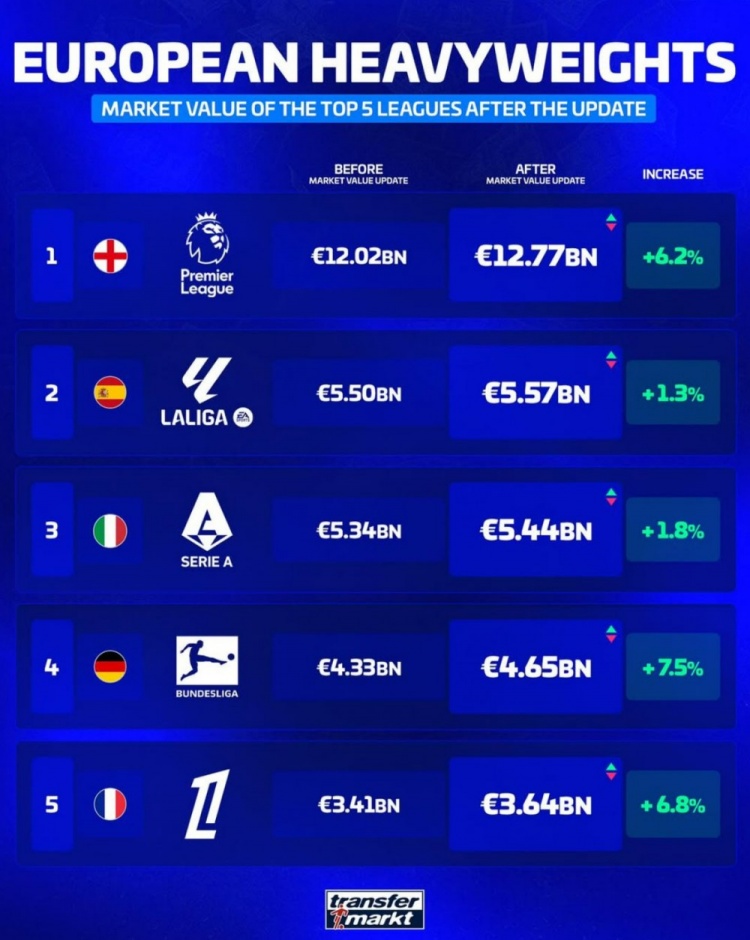 10月20日讯 德转此前更新了足坛球员身价,并清点了五大联赛球队总身价榜,其中英超遥遥高出,以下为具体情况: