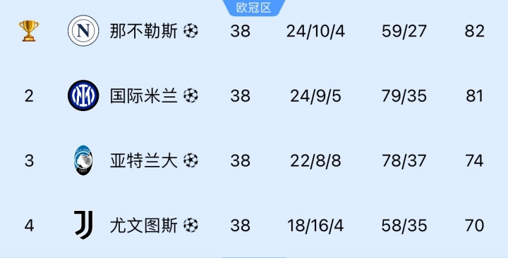 上赛季,孔蒂指导的那不勒斯未进入任何欧洲比赛,最终联赛24胜10平4负积81分朝上死后国米1分夺情愿甲冠军,并得到本赛季欧冠阅历。