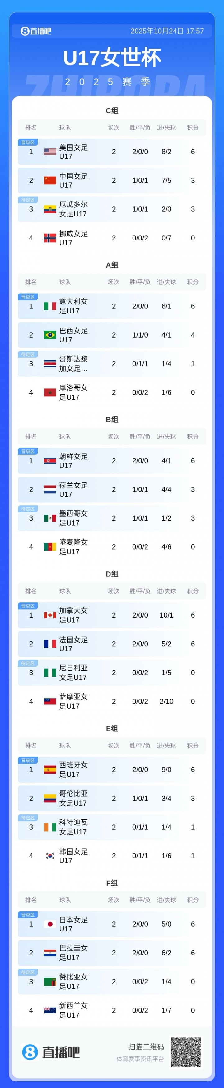 本届U17女足寰宇杯共有24队分为6个小组,每组前二以及4个得益最佳的小组第三构成16强。若中国女足U17末轮胡闹,则可能需要以小组第三的身份与其他队相比战绩。