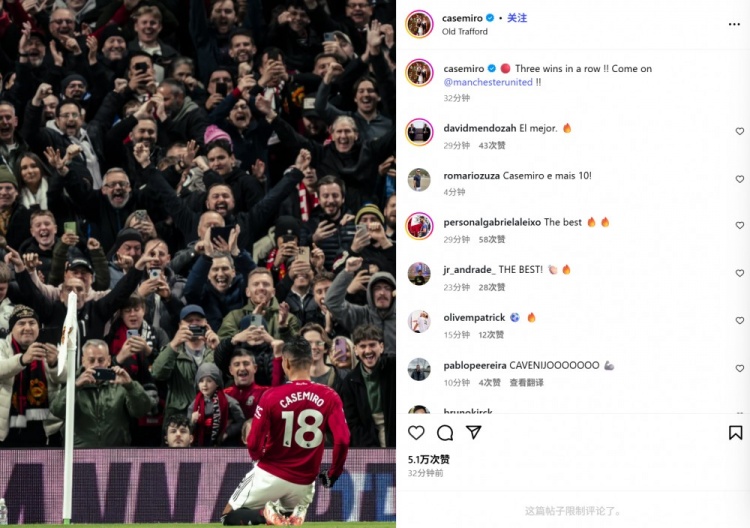 他也在赛后通过社媒晒出我方的滑跪庆祝照,并配文:“三连胜!@曼联,加油!”