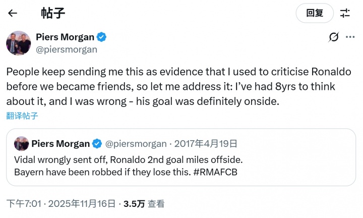 11月16日讯 当天闻明主抓东谈主皮尔斯·摩根在社媒发文,对8年前我方的社媒言论进行谈歉,默示我方已经错怪了C罗。