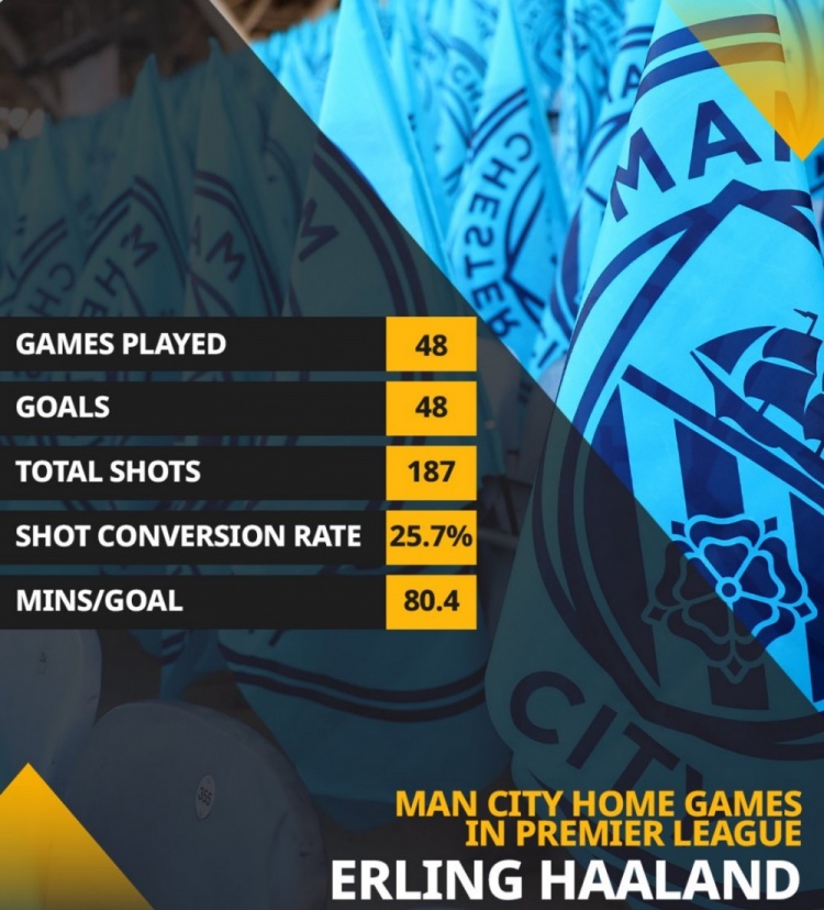 Opta统计了哈兰德在英超主场比赛的进球数据,他出战48场英超主场比赛,打进48球,而英超历史唯独在少于50场主场比赛中打进50球的是希勒,他只用了47场比赛。