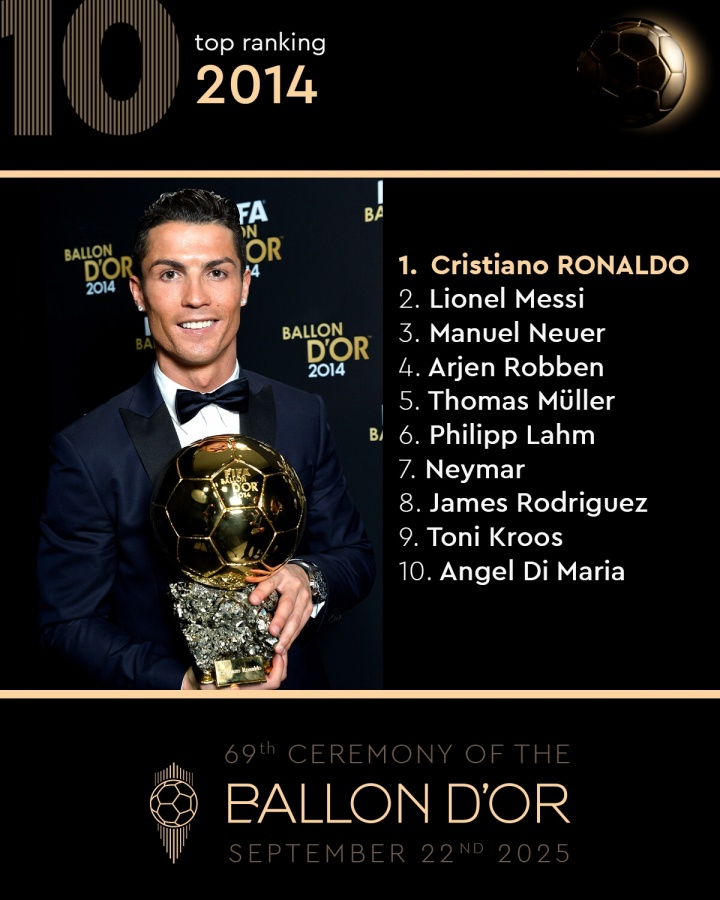 08月23日讯 金球奖官方继续每天一期盘货往届金球得主,预热一个月后的2025金球授奖庆典,今天来到了2014年。2014年C罗获取了我方生存的第3座金球奖,梅西、诺伊尔名次前三。