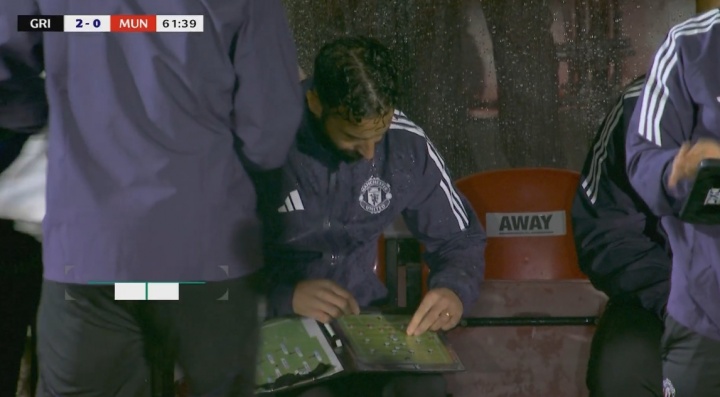 08月28日讯 联赛杯曼联vs格林斯比,第62分钟镜头给到场边,阿莫林在场边拿着政策板。