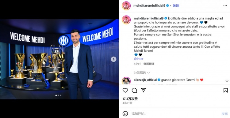 “国外米兰将永远留在我心中。带着谢意之情,我向你们通盘东谈主告别,并道贺你们改日获得更多荣誉!满怀情愫地这样作念。——梅赫迪-塔雷米。”