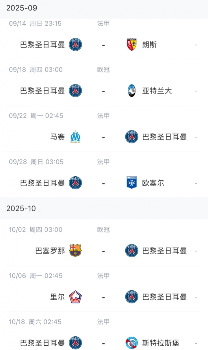 巴黎改日赛程如下,登贝莱无缘出战10月初对阵巴萨的比赛: