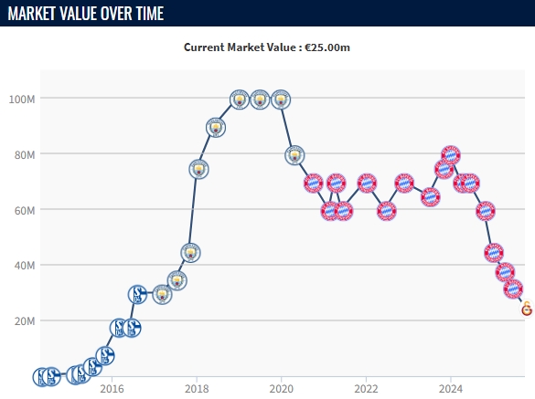 10月01日讯 德转当天更新了土超球员身价,其中今夏解放身从拜仁加盟加拉塔萨雷的萨内,身价从3200万欧跌至2500万欧。