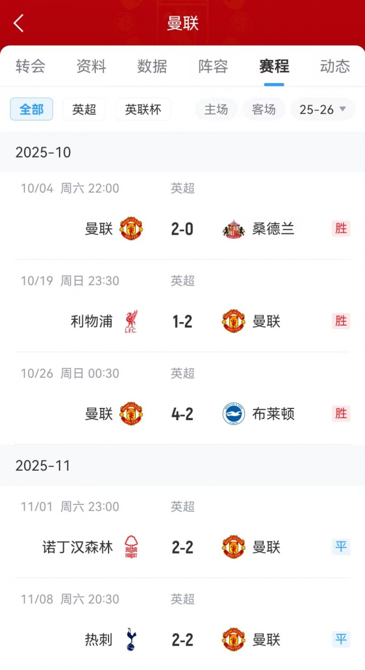 最近的五轮联赛中,曼联一度接连校服桑德兰、利物浦、布莱顿,获取三连胜;上轮联赛2-2战平丛林。本轮对阵热刺的比赛,曼联在全场补时阶段被反超的情况下,由德里赫特打进了绝平的进球,从客场带走一分。