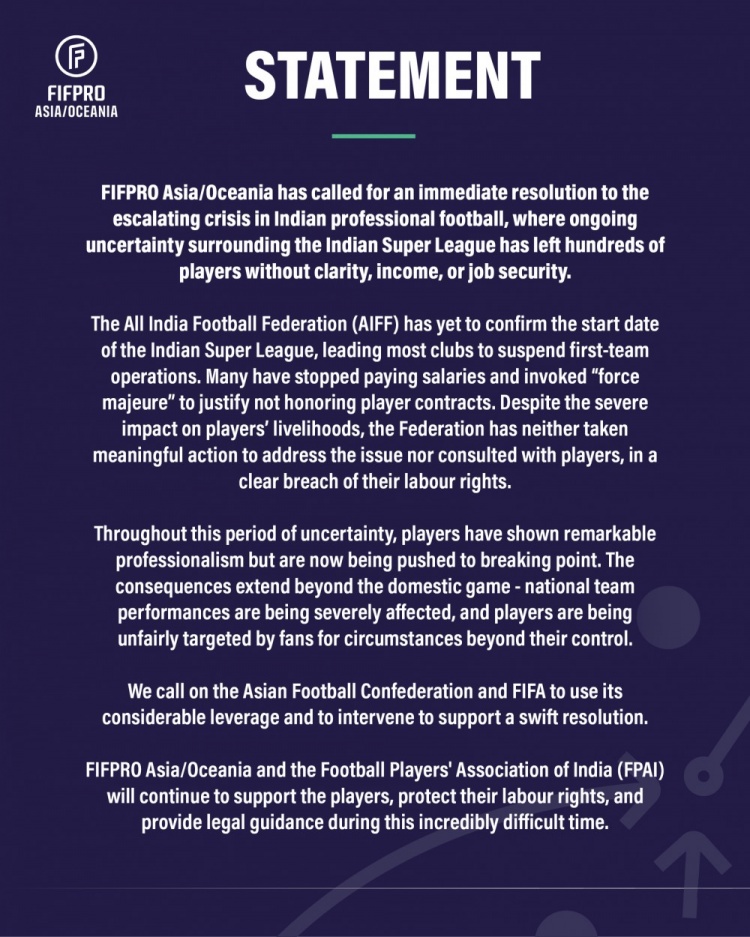海外管事足球通顺员协会亚洲/大洋洲分会敕令立即贬责印度管事足球日益加重的危险,印度超等联赛执续的不笃定性已导致数百名球员堕入远景不解、收入中断、职责保险缺失的窘境。