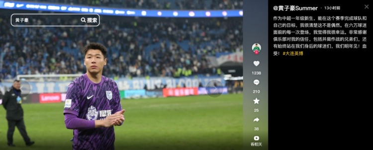 11月24日讯 2025赛季中超联赛战罢,大连英博取得9胜9平12负的战绩,取得第11名。赛后,大连英博门将黄子豪更新了个东谈主酬酢媒体。