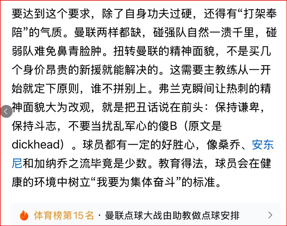 引援的时期,曼联的引援部门怂;队内搞定的时期,曼联对刺头怂;濒临强悍的敌手,曼联球员怂,曼联从上到下齐很怂,这即是曼联大齐次重建的根源,你莫得宝石到底的勇气。