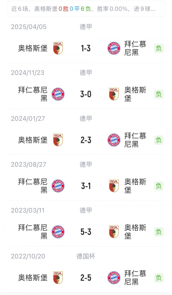 两队之间近6次交手,拜仁全胜。