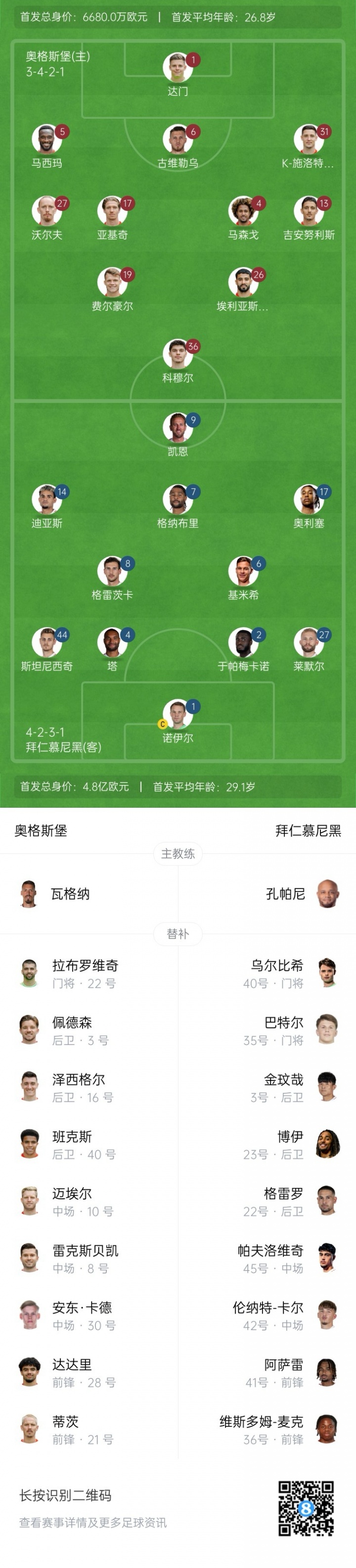 奥格斯堡首发:1-达门、6-古维勒乌、5-马西玛、31-K-施洛特贝克、4-马森戈、17-亚基奇、13-吉安努利斯、27-沃尔夫、26-埃利亚斯-萨德、19-费尔豪尔、36-科穆尔