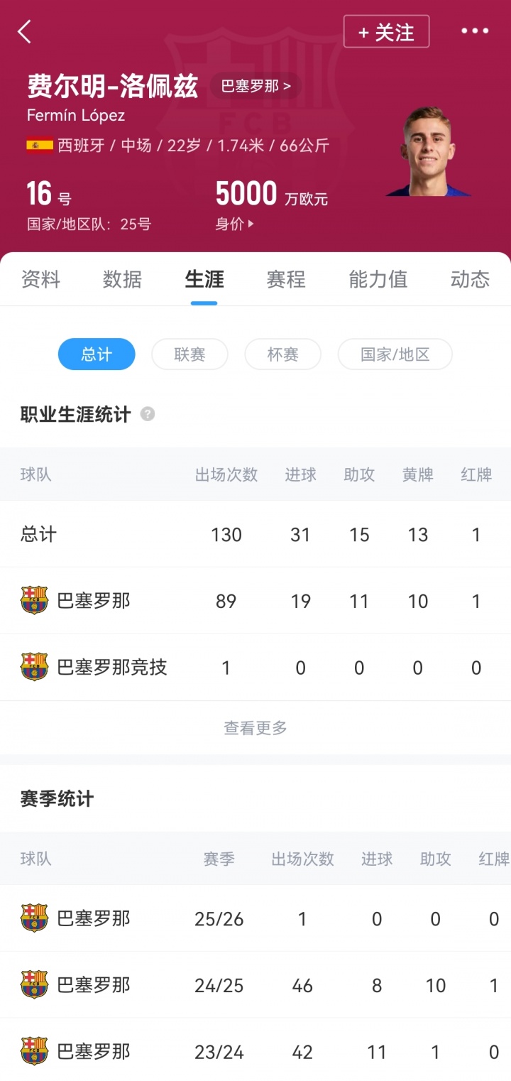 22岁的费尔明出自巴萨青训,收敛当今共为巴萨一线队出场89次,打入19球11助攻,他的德回身价为5000万欧元。
