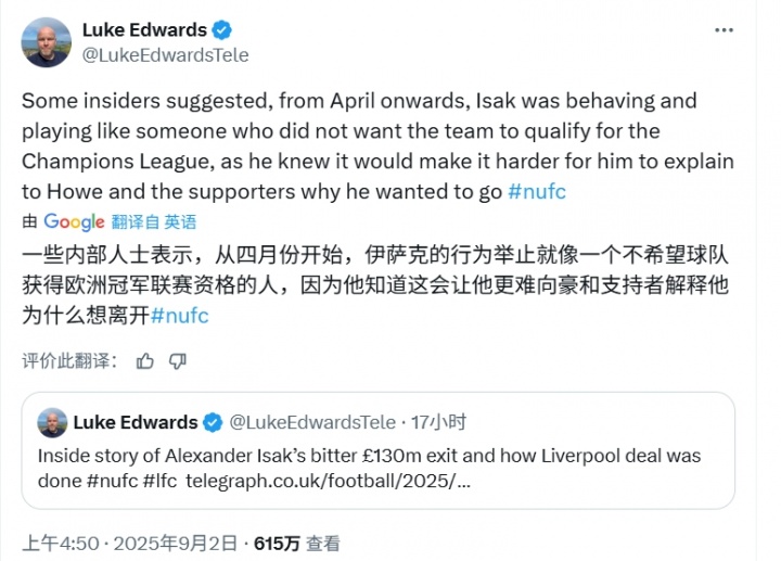 这家英国天下性报纸被以为是逐日电讯报,逐日电讯报今夏执续报谈伊萨克转会闹剧的纽卡跟队Luke Edwards今晨发帖暗示,伊萨克从四月份起就进展得像不但愿球队取得欧冠阅历相似。