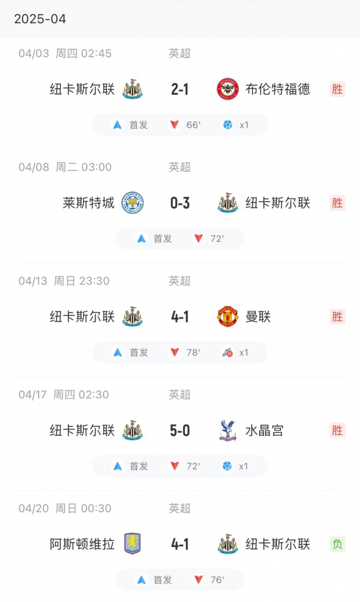 伊萨克自四月起为纽卡出战了9场比赛,孝敬4球1助。
