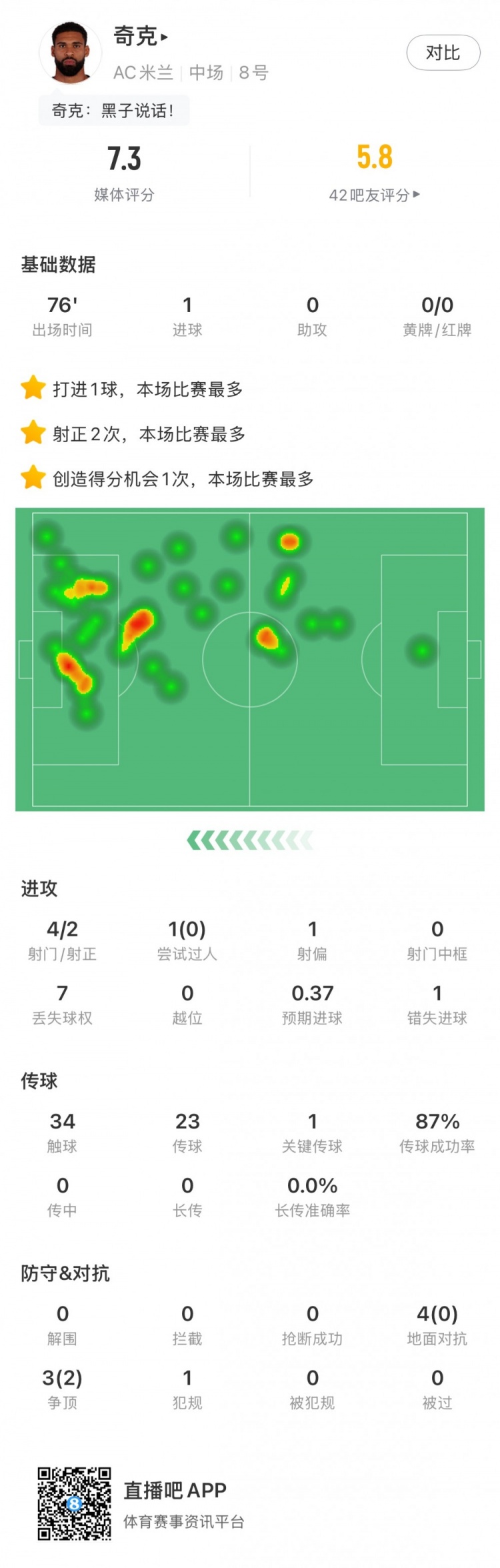 8月30日讯 意甲次轮米兰客场2-0打败莱切,奇克此役代表米兰首发出战,球员具体数据如下: