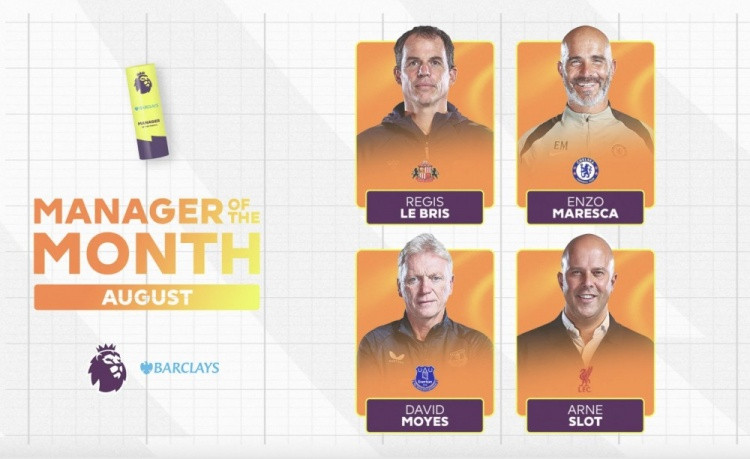 直播吧9月4日讯英超官方公布8月最好证实候选。桑德兰主帅布里斯、切尔西主帅马雷斯卡、埃弗顿主帅莫耶斯以及利物浦主帅斯洛特入围。