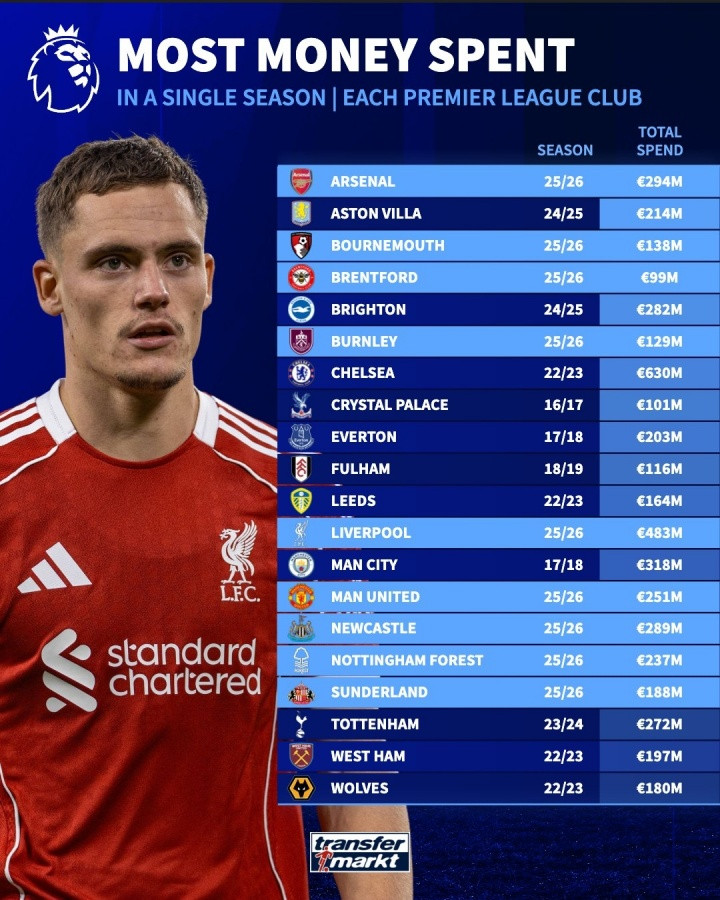 英超各球队单赛季开销记录(球队按首字母排序)