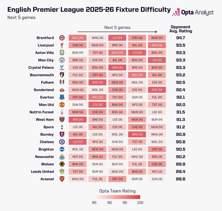 10月02日讯 Opta发布了25-26赛季翌日五轮赛程难度评级,数据分析暴露,布伦特福德将濒临最严峻的考试。