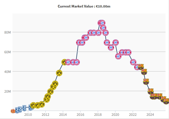 莱万的身价曾在2018年效率拜仁工夫达到巅峰的9000万欧。