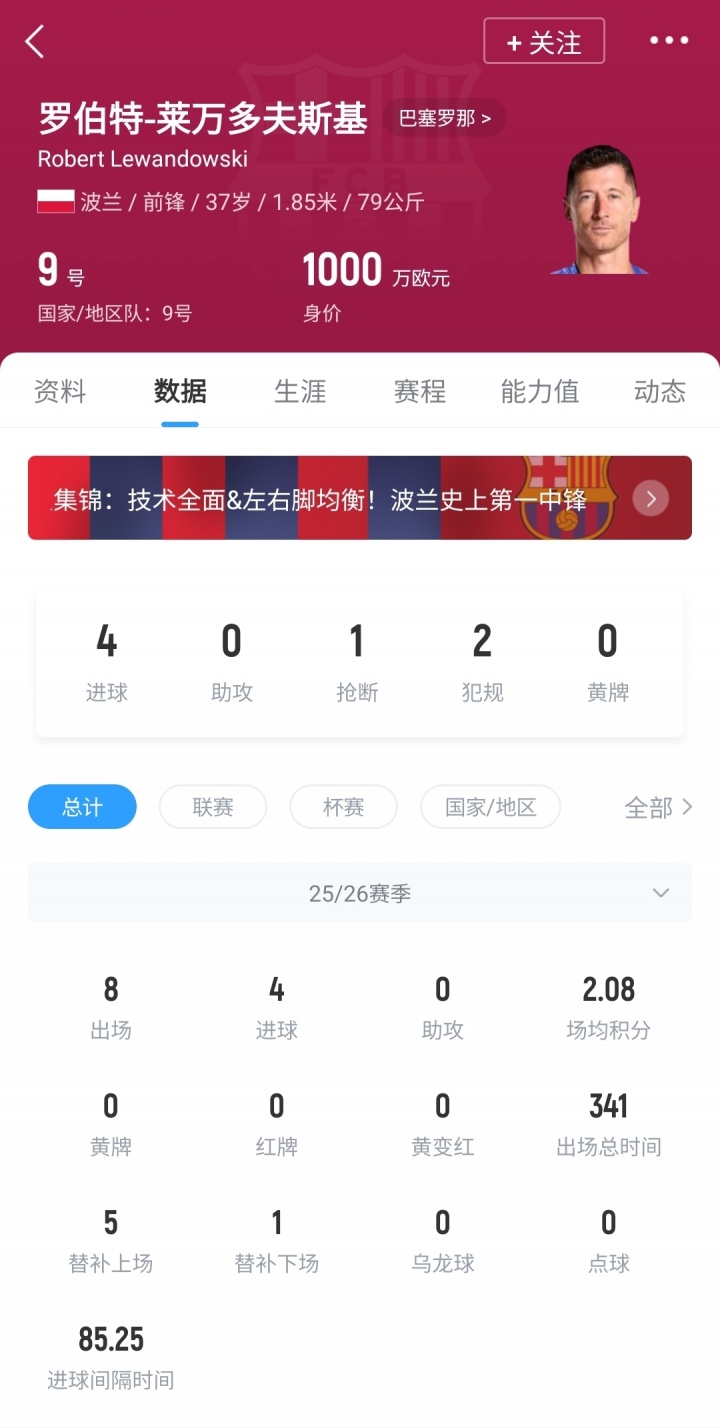 本赛季莱万代表巴萨出战8场比赛,打进4球。