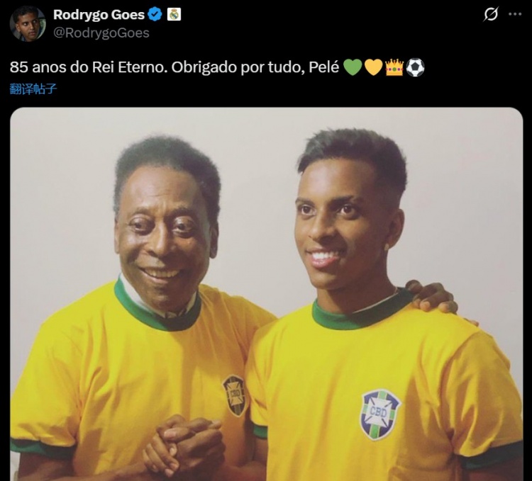 罗德里戈写谈:“不灭之王85岁,感谢你所作念的一切,贝利。”