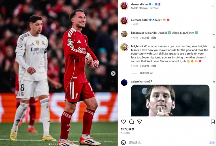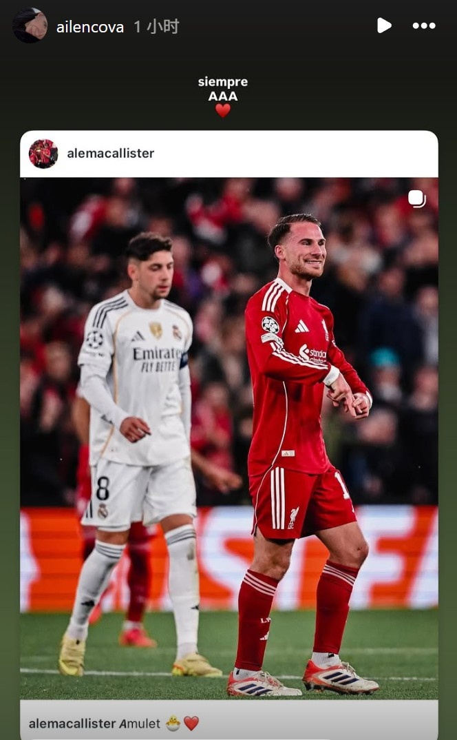 女友也通过社媒用双关回报了麦卡的示爱:“AAA,始终”(麦卡利斯特的名字亚历克西斯Alexis、女友名Ailén、两东谈主的孩子Alaia的首字母齐为A)。