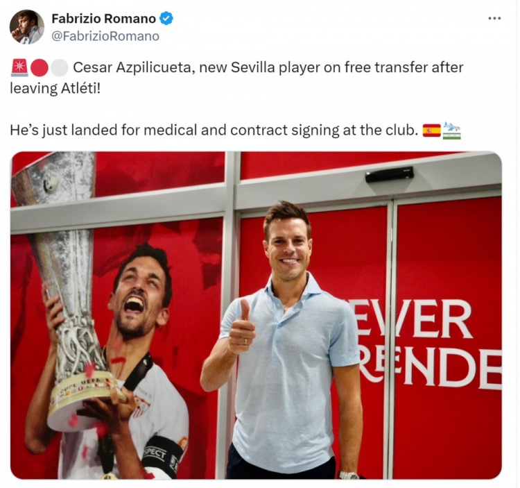 阿斯皮利奎塔今夏离开马竞,成为开脱球员,罗马诺领会,这位36岁的西班牙后卫将免签加盟塞维利亚。
